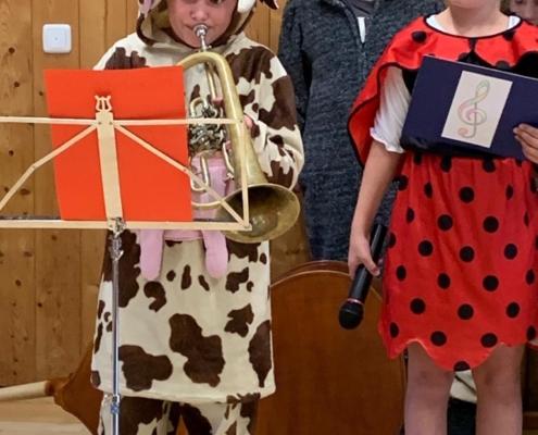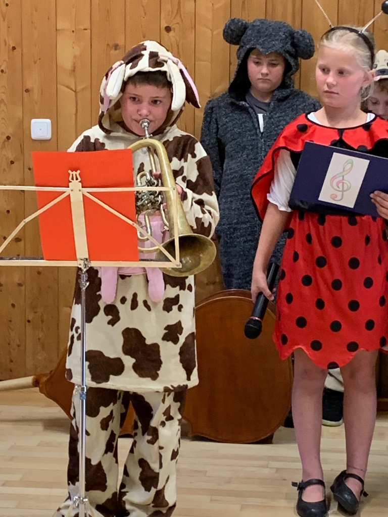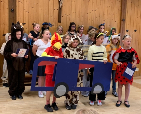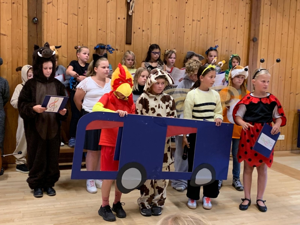 Beim Konzert des Schulchores war der Pfarrstadl voll belegt. Zuerst gab es musikalische Rückblicke auf die zehn verschiedenen Auftritte in diesem Schuljahr. Nach der Pause verwandelten sich die Kinder in Tiere, die auf ihrer Fahrt nach Griechenland die unterschiedlichsten Lieder und Instrumente kennenlernten. So spielten alle Viertklässler auf ihren Instrumenten und sangen ein kurzes Solo. Sie haben ihren Beat gefunden!