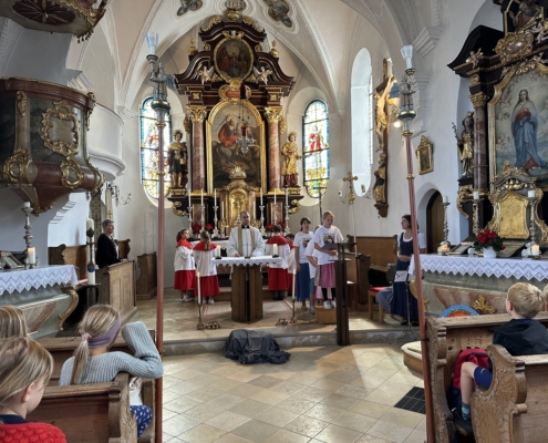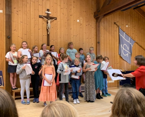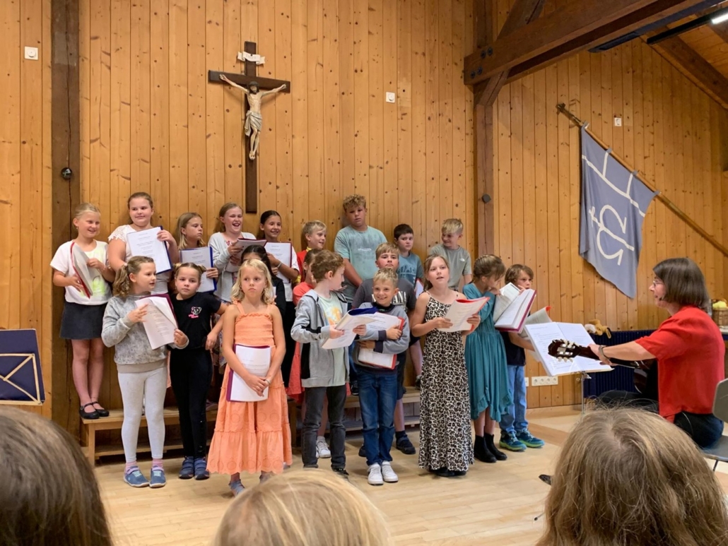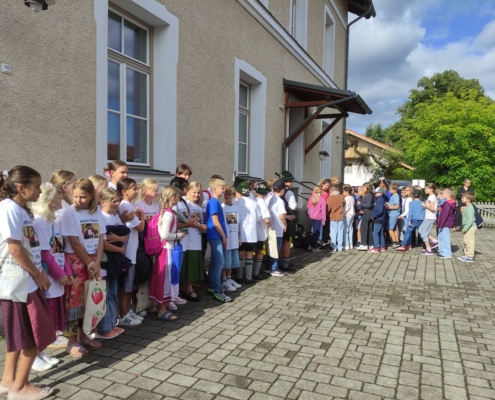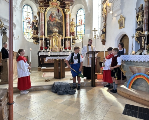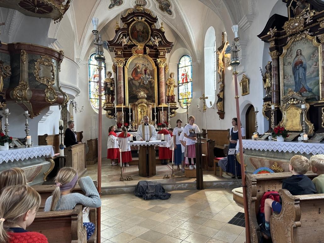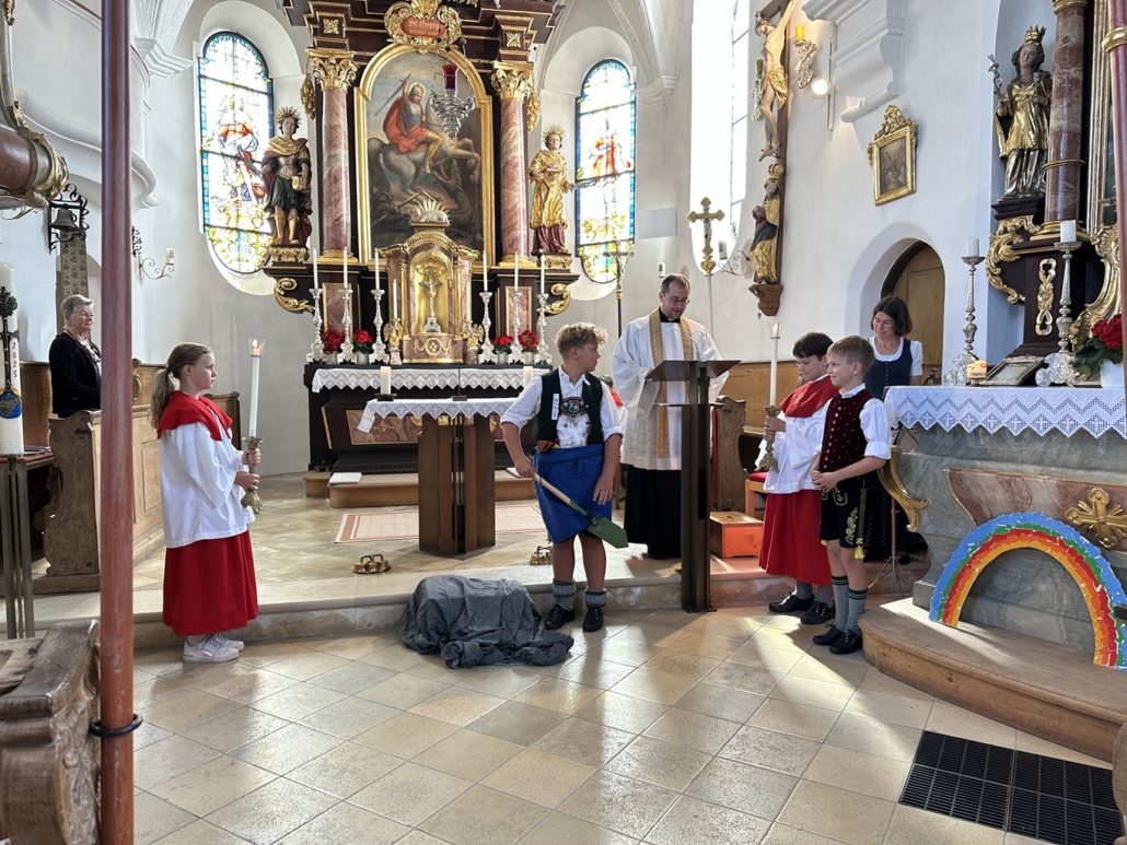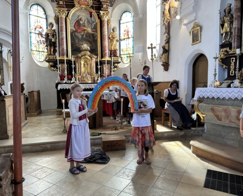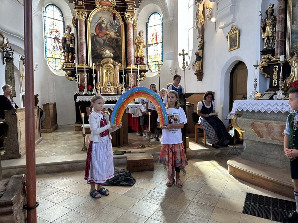 Doch bevor es soweit war, durften die Viertklässler durch ein Spalier das Schulhaus verlassen und wurden mit einem Lied verabschiedet. Beim anschließenden Gottesdienst in St. Georg berichteten sie von ihren Schätzen, die sie in der Grundschulzeit gesammelt haben. Beim Segen regnete es Herzen vom Himmel.