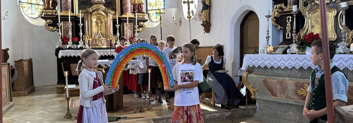 Doch bevor es soweit war, durften die Viertklässler durch ein Spalier das Schulhaus verlassen und wurden mit einem Lied verabschiedet. Beim anschließenden Gottesdienst in St. Georg berichteten sie von ihren Schätzen, die sie in der Grundschulzeit gesammelt haben. Beim Segen regnete es Herzen vom Himmel.