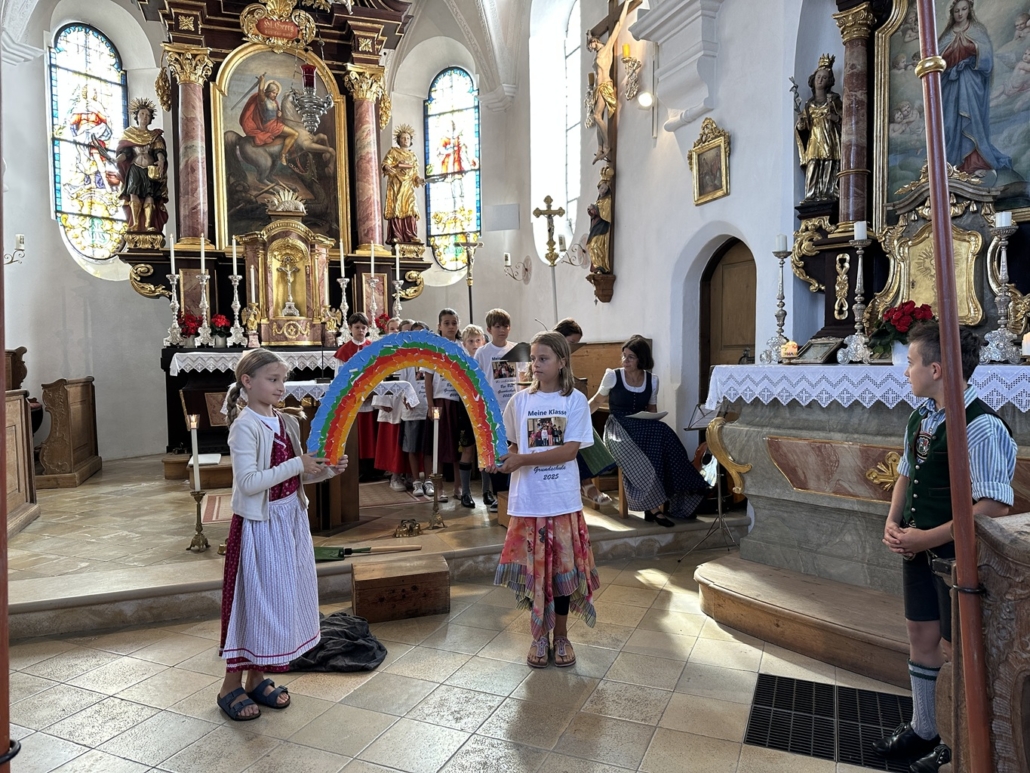 Doch bevor es soweit war, durften die Viertklässler durch ein Spalier das Schulhaus verlassen und wurden mit einem Lied verabschiedet. Beim anschließenden Gottesdienst in St. Georg berichteten sie von ihren Schätzen, die sie in der Grundschulzeit gesammelt haben. Beim Segen regnete es Herzen vom Himmel.