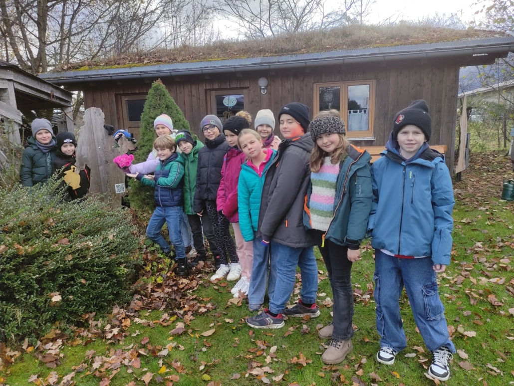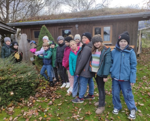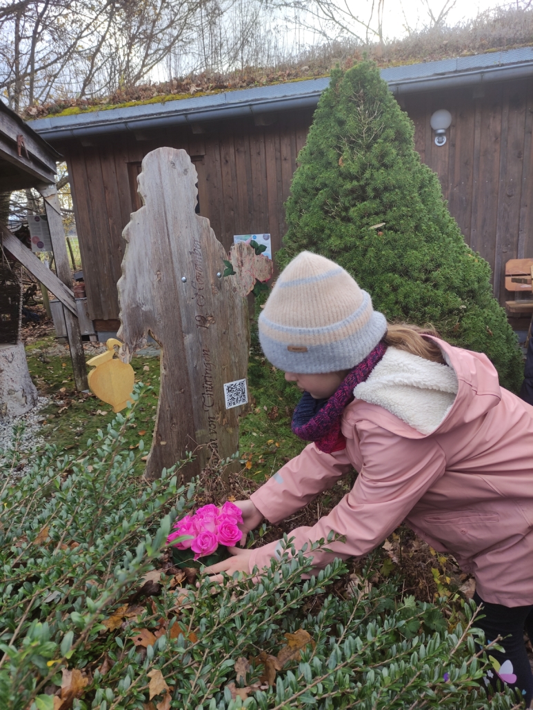 Am Gartenbauvereinsgelände stehen viele hölzerne Figuren. Eine von ihnen ist die Hl. Elisabeth. Für sie hat die Schule 2021 die Patenschaft übernommen. In diesem Jahr kümmerte sich die Klasse 4b um das „Patenkind“. Nachdem sie die Geschichte dieser besonderen Frau gehört hatten, steckten sie ein Herz aus Rosen und brachten es ihr zusammen mit einem Lied zum Namenstag.